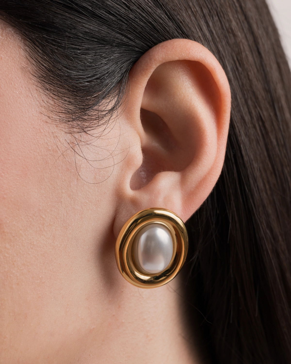 Aretes largos con un diseño sutil en forma de óvalo con una perla al centro que eleva desde el look más cotidiano hasta el más sofisticado.