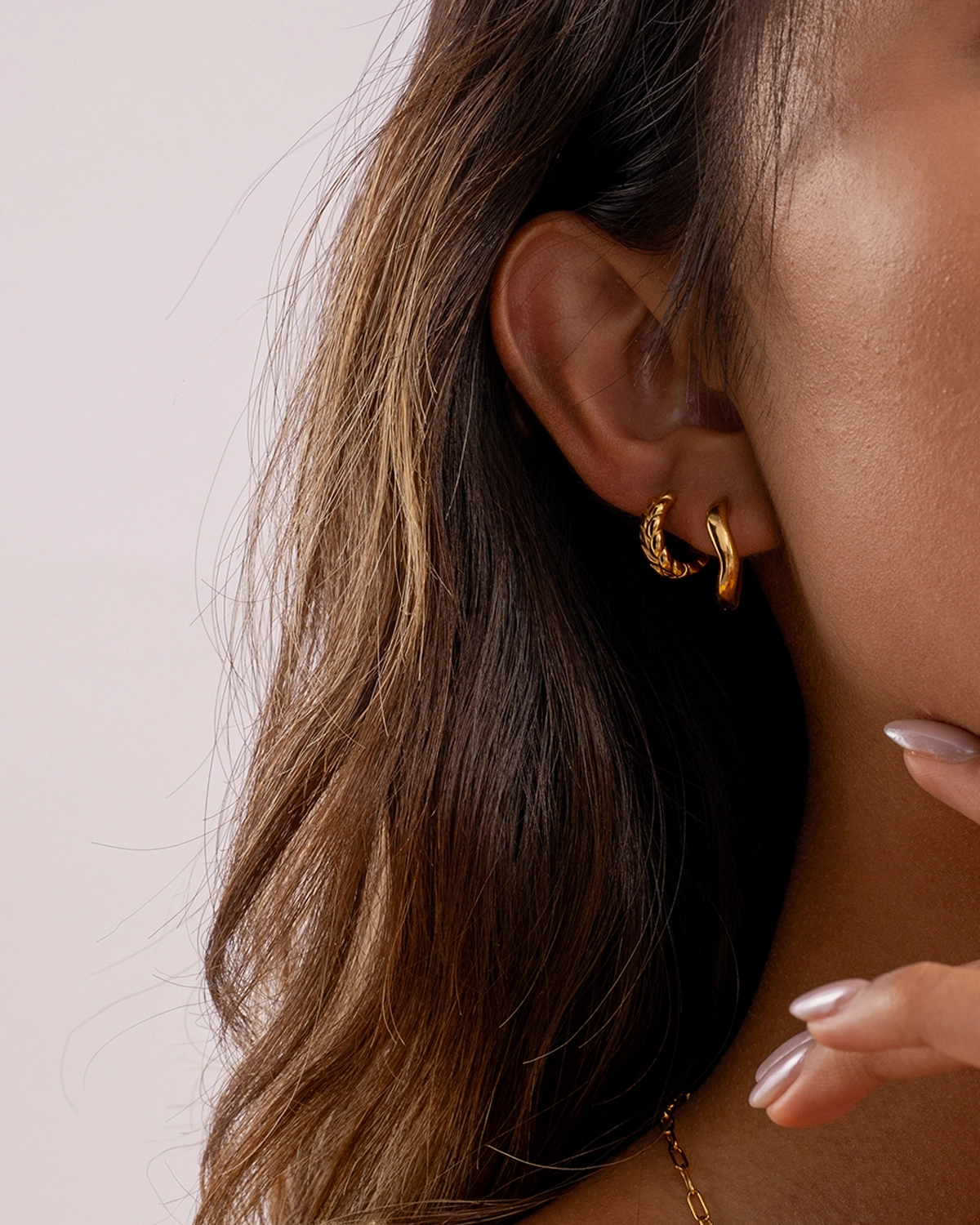 Argollas con un diseño trenzado, sutil y atemporal que los convierte en el accesorio perfecto para cualquier ocasión aportando un brillo refinado que eleva desde el look más cotidiano hasta el más sofisticado.
