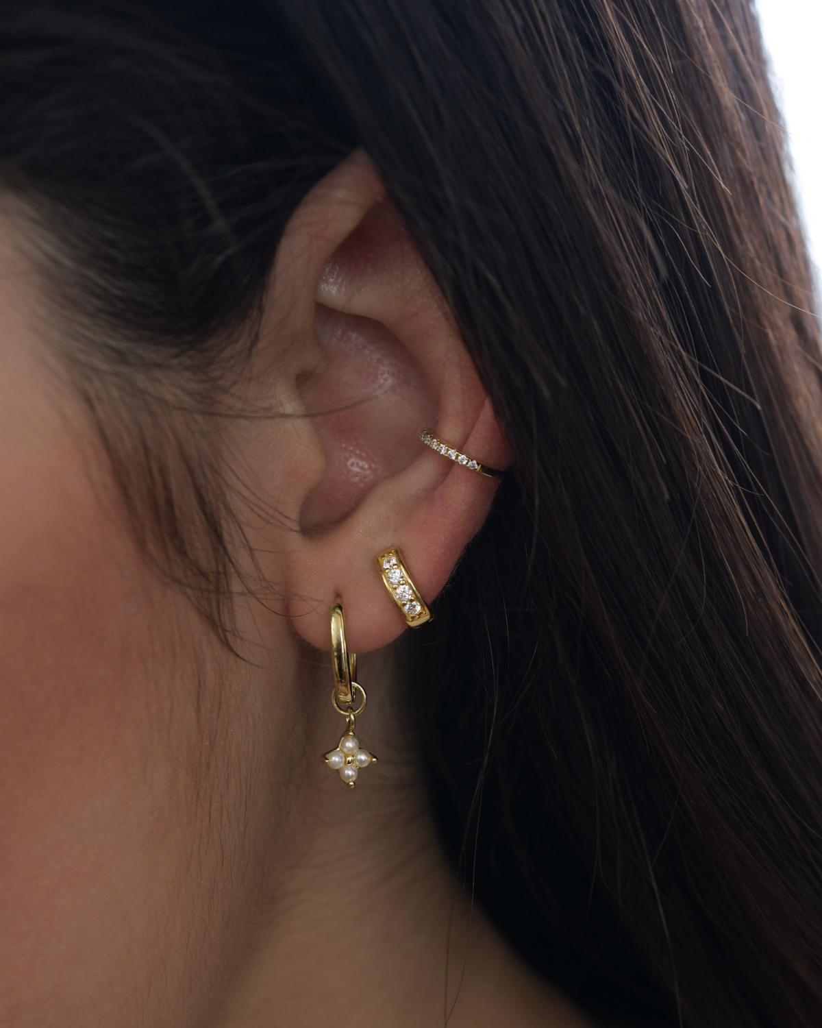 Estiliza tus «huggies» con este hermoso charm. Un diseño sofisticado acompañado de 4 perlas.