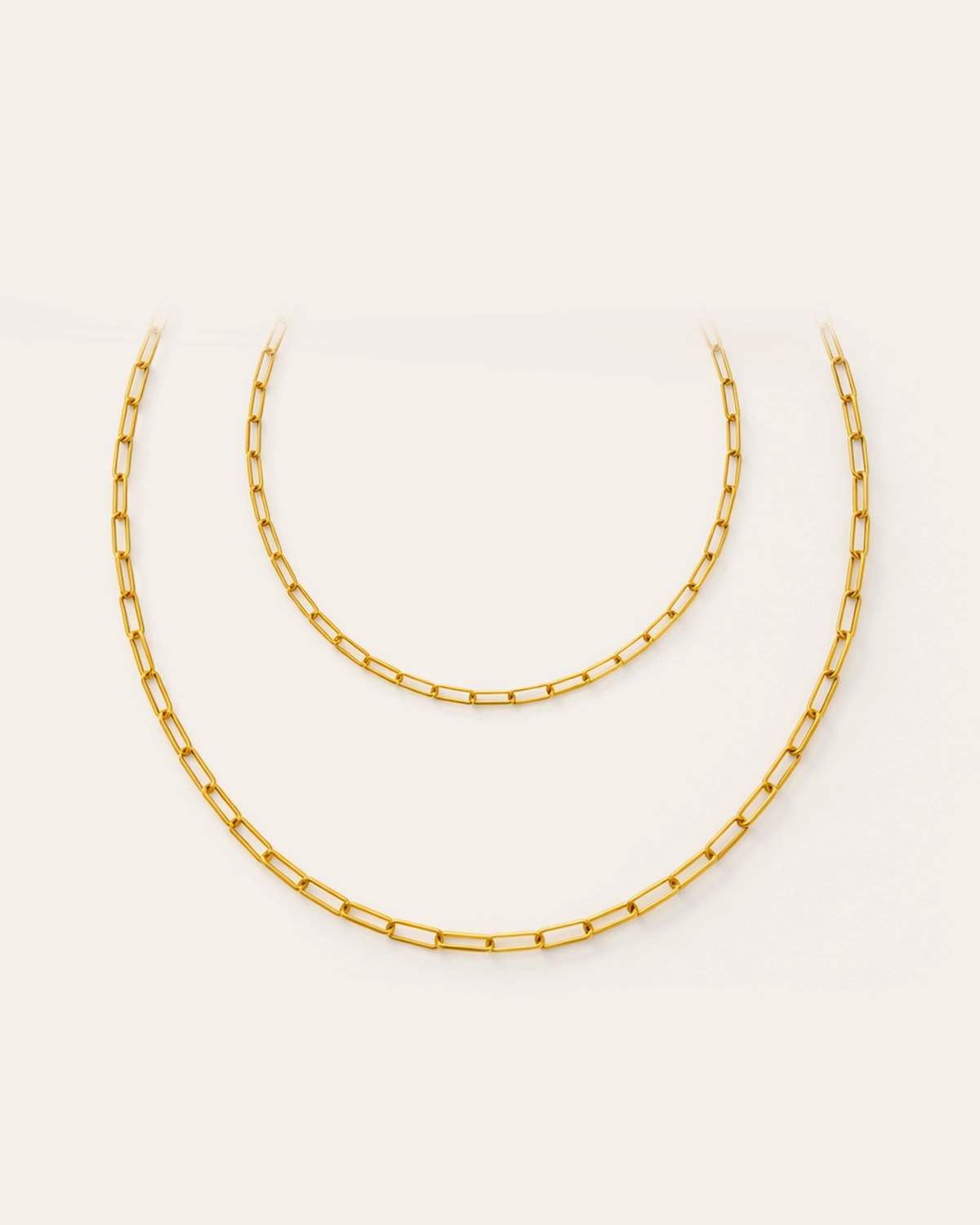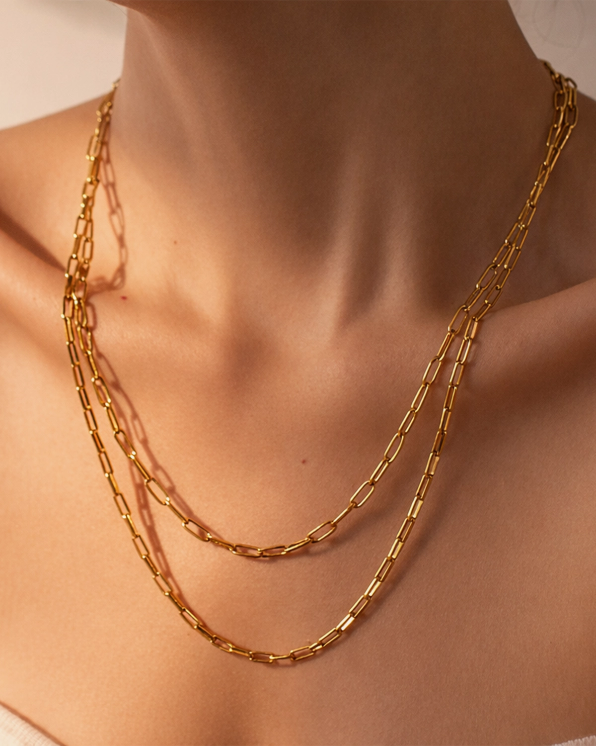 Collar doble estilo paperclip, clásico en dorado, con un diseño clásico y moderno.