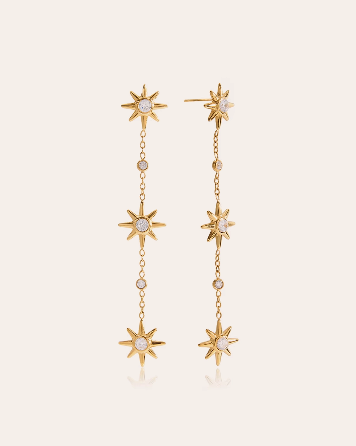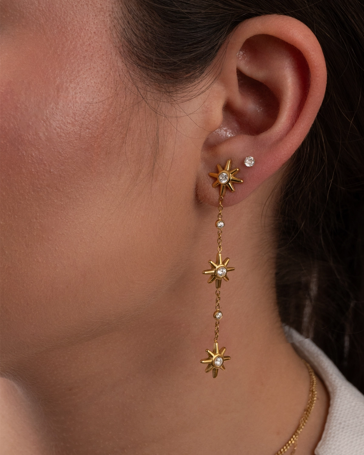 Aretes largos con un diseño sutil en forma de sol los convierte en el accesorio perfecto para cualquier ocasión aportando un brillo refinado que eleva desde el look más cotidiano hasta el más sofisticado.