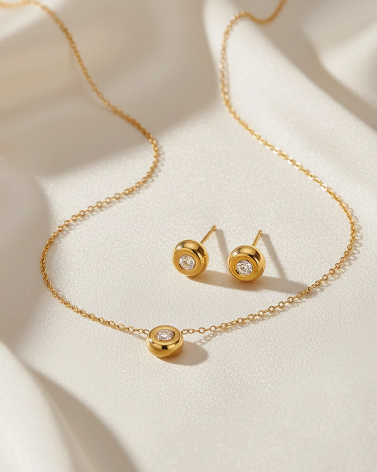 Set de collar + aretes con un diseño sutil y atemporal los convierte en el accesorio perfecto para cualquier ocasión aportando un brillo refinado que eleva desde el look más cotidiano hasta el más sofisticado.